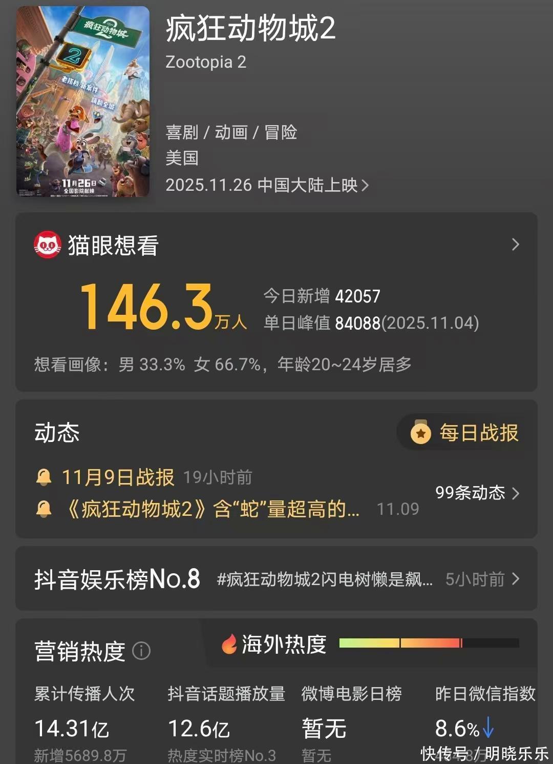 要是从全球范围看,《阿凡达 3》大概率是最大赢家,但单说咱们内地市场,感觉《疯狂动物城 2》会更吃香。不信看看数据呀,现在国内电影平台上,《疯狂动物城 2》都有超 14 亿人帮忙传播,话题播放量也快 13 亿了,可《阿凡达 3》这两项数据连 1 亿都没到。想看人数更是差得远,前者都超 300 万了,后者还不到 70 万,差距真的很明显~